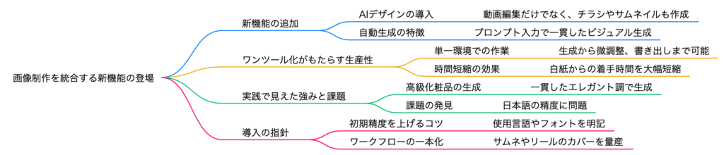 - 1つのアプリで完結 – 動画編集と画像制作を統合