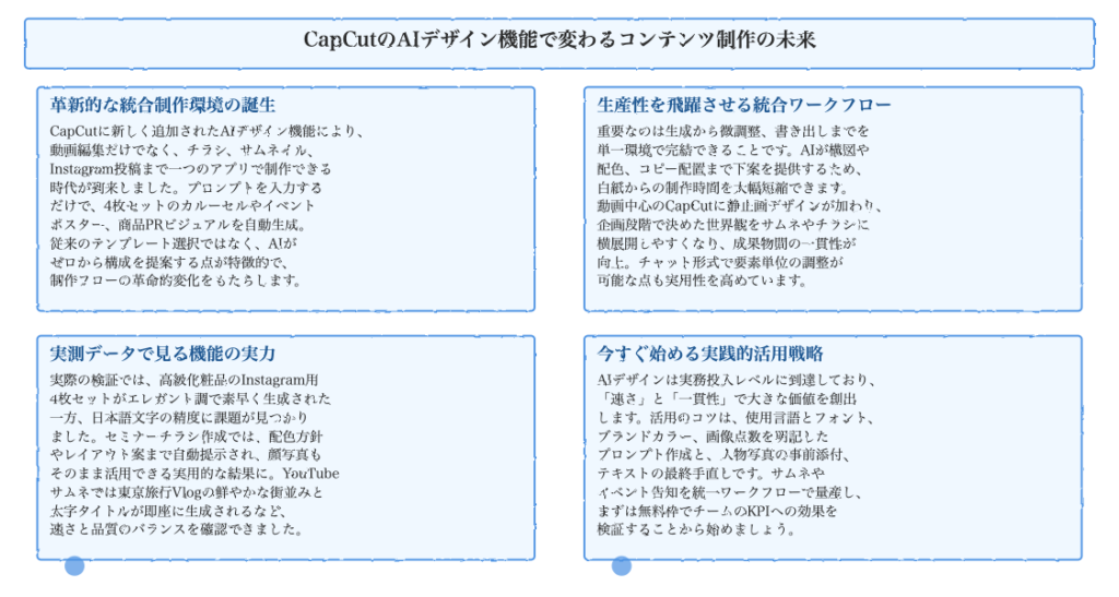 2025年10月16日に発見されたCapCutの新機能「AIデザイン」は、動画編集アプリが総合的なクリエイティブプラットフォームへと進化する大きな一歩となりました。本記事では、Instagram投稿、セミナーチラシ、YouTubeサムネイルなど、実際に様々なデザインを生成してみた体験を詳しくお伝えしました。現時点では日本語の精度や顔写真の再現性など、いくつかの課題が残されていますが、それでもこの機能が持つ可能性は計り知れません。一つのアプリで動画編集から画像生成まで完結できるという利便性は、コンテンツクリエイターにとって大きな価値があります。無料で使える今のうちに、ぜひ実際に触れてみて、自分なりの活用法を見つけていただきたいと思います。AIとクリエイターが協働する新しい時代において、CapCutのようなツールは私たちの創造性を解放し、これまで以上に多様で魅力的なコンテンツを生み出す手助けをしてくれるでしょう。技術は日々進化していますので、今後のアップデートにも注目しながら、この革新的な機能を最大限に活用していきましょう。