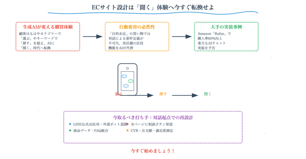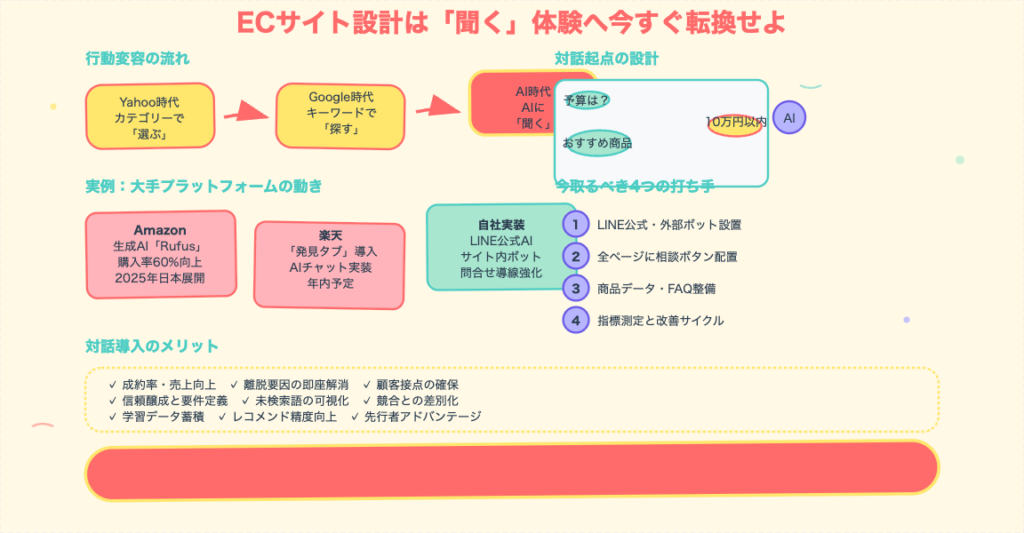 ECサイトの作り方が大きく変わろうとしている。Yahoo時代はカテゴリーから「選ぶ」、Google時代はキーワードで「探す」が主流だったが、ChatGPT時代はAIに「聞く」へと移行する。AmazonのRufusは購入率60%向上を実現し、楽天も発見タブを導入した。今後のECサイトには生成AIチャット機能が必須となり、目的が決まっていない顧客とも対話しながら買い物に誘導できるようになる。LINE公式アカウントのAIチャットボット導入が第一歩となる。