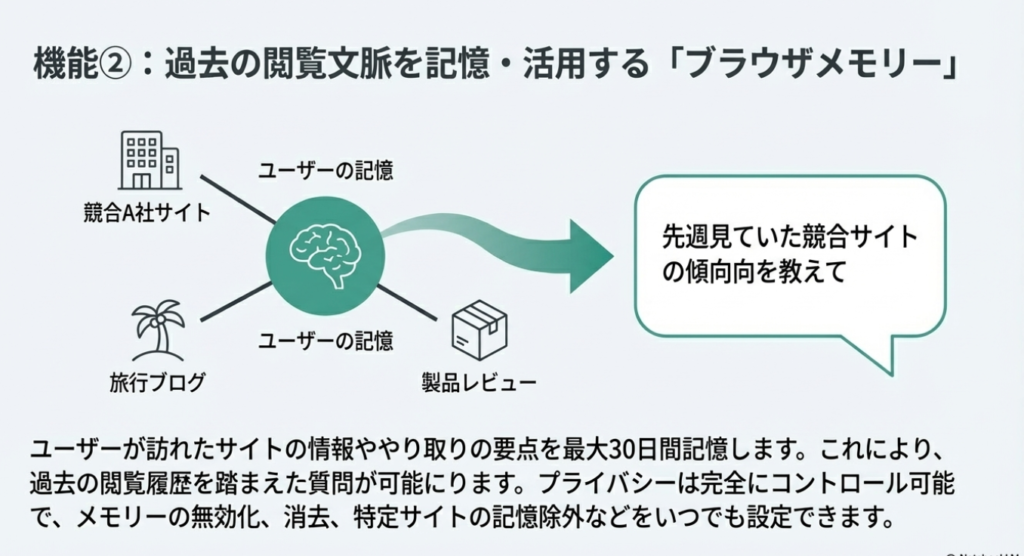 • Atlasによる解決策: 担当者は複数の競合サイトのタブを開き、Atlasに**「各ページの訴求ポイントを要約して」**と指示するだけで、瞬時に比較分析資料の下書きが完成します。さらに、「競合A社の過去1ヶ月のXの投稿を分析し、プロモーションの傾向をレポートして」と指示すれば、AIが投稿内容を解析し、キャンペーンの頻度や内容、ユーザーの反応といったインサイトを自動で抽出します。これにより、担当者はデータ収集ではなく、分析結果に基づく戦略立案に集中できます。