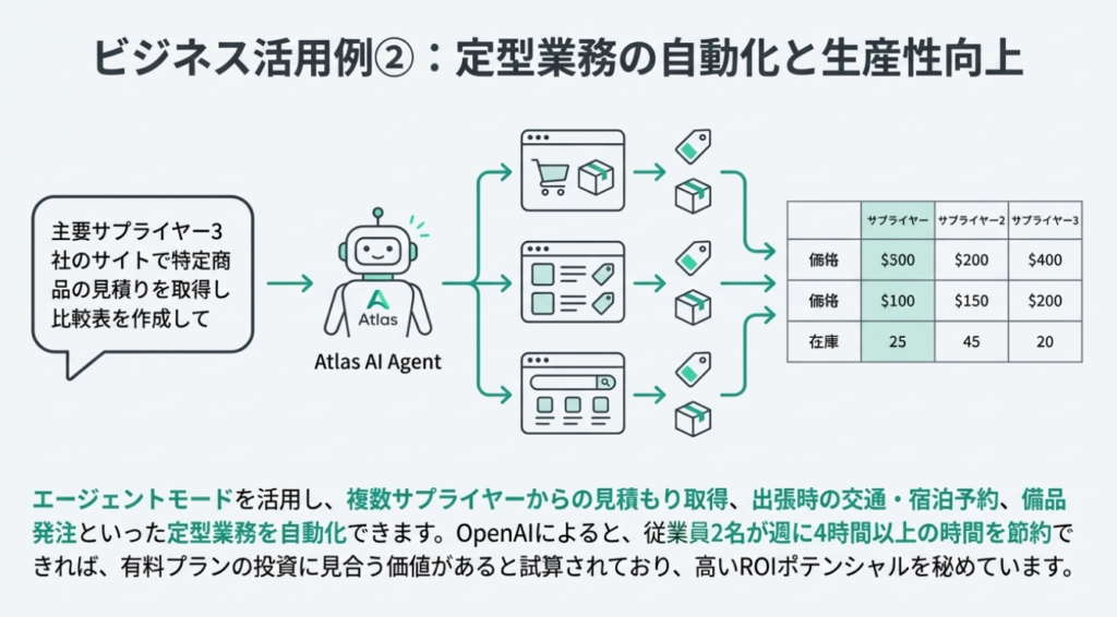 Atlasの価値は、具体的な時間削減効果として数値化できます。OpenAIは、**「試験運用で2名の従業員が週4時間以上の節約に成功すれば、Atlasの有料機能の投資に見合う価値がある」**との見解を示しています。