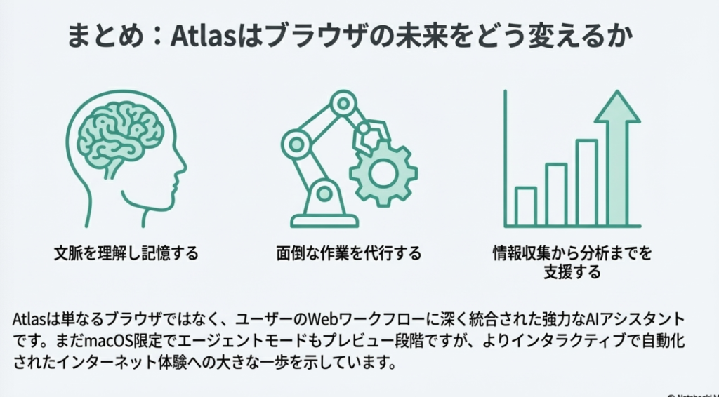 当社の課題は、単に情報を効率的に集めることではなく、その先の「作業」をいかに削減するかです。その点において、AIが人間の代わりにブラウザを操作してくれるAtlasは、最も直接的かつ強力なソリューションと言えます。