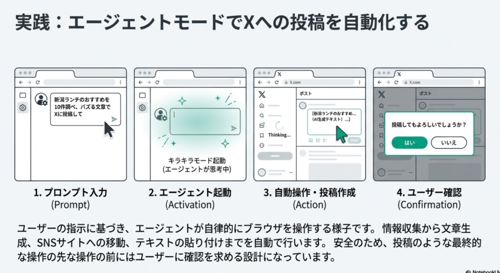 • SNSへの自動投稿: 「新潟でランチのおすすめ店を調べて、バズるような文章でXに投稿して」といった複合的な指示に基づき、AIが情報収集からコンテンツ生成、そして実際の投稿操作までを一気通貫で実行します。
