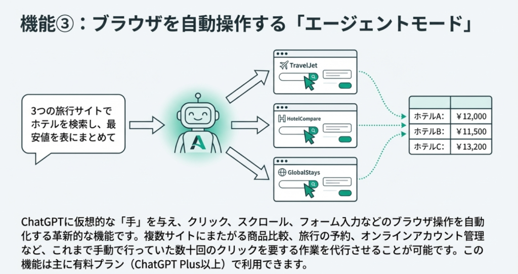 • 複数サイト横断での情報収集と比較: 「指定した3つの旅行サイトでホテルを検索し、最安値を表にまとめて」といった自然言語での指示だけで、AIが各サイトを巡回し、情報を収集・比較して結果を提示します。
