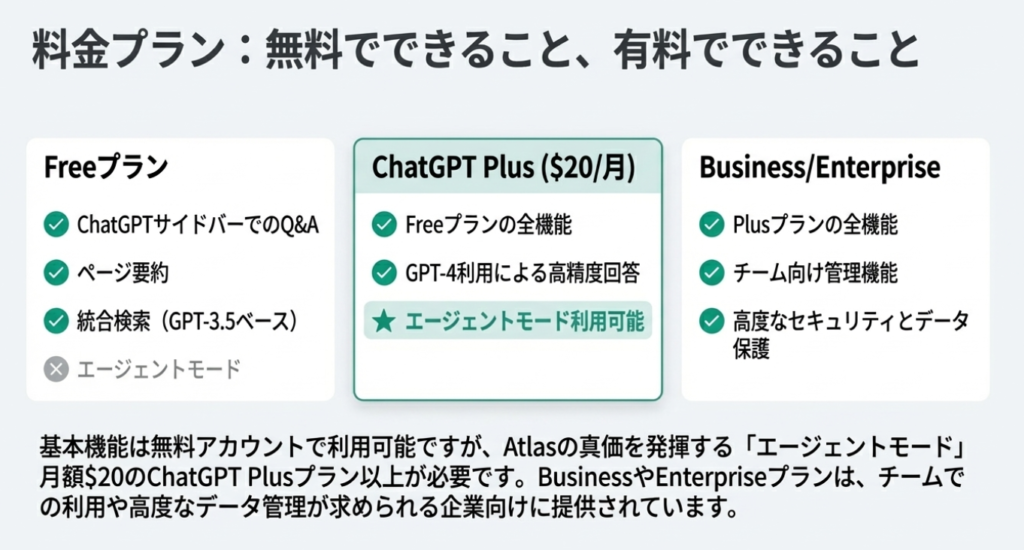 Atlasのポテンシャルを最大限に引き出すためには、有料プランへの加入が不可欠です。特に、本提案の核となる**「エージェントモード」の利用や、企業の機密データを扱う上で必須となる「企業のデータがモデル学習に使用されない」というデータプライバシーの保証**は、有料プランでのみ提供されます。