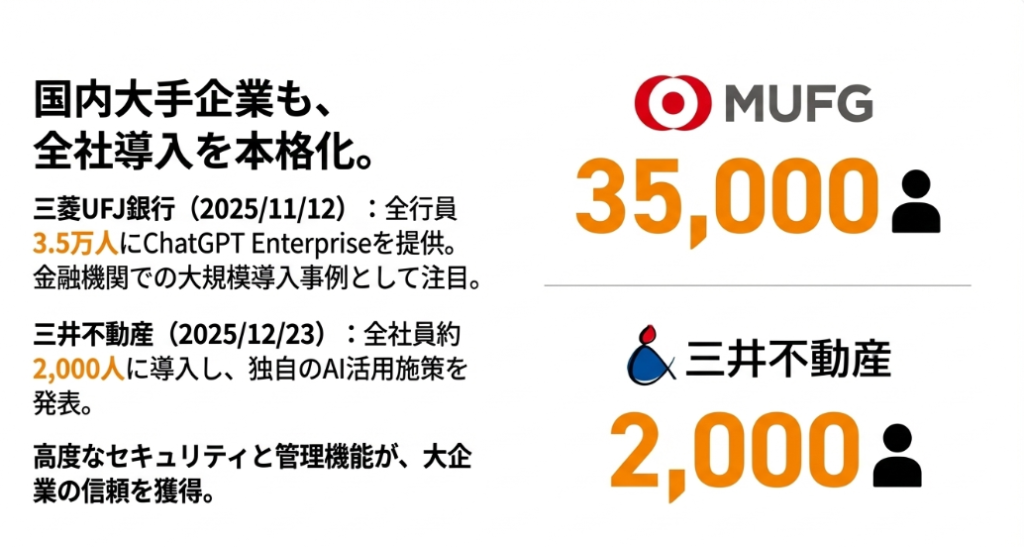 5. 社会インフラとしての浸透:三井不動産の全社導入(12月23日) 金融機関に続き、不動産業界の雄である三井不動産も約2,000人の全社員への導入を発表。大企業が自社の業務基盤としてChatGPTを組み込み始めたことは、ChatGPTが社会の「エコシステム」の一部となりつつあることを力強く示しています。