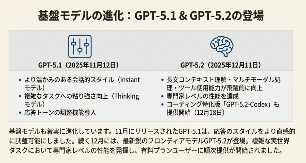 1. より自然な対話へ:新モデル「GPT-5.1」登場(11月12日) 新しい頭脳である「GPT-5.1」がリリースされました。これにより、ユーザーは以下のようなメリットを享受できるようになりました。