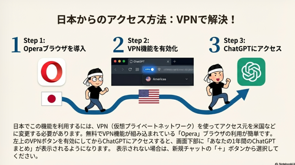 A1: 「1年間のChatGPTまとめ」機能は現在、地域制限により日本からは直接アクセスできません。この機能を利用するには、VPN(仮想プライベートネットワーク)を使用する必要があります。具体的には、Operaブラウザーの無料VPN機能を使って、アクセス地域をアメリカなどに変更することで利用可能になります。Operaブラウザーをインストールし、左上のVPN機能をオンにしてから、ChatGPTにアクセスしてください。画面下部に「あなたの1年間のChatGPTまとめ」が表示されるようになります。ただし、チームプランなど一部のアカウントタイプでは利用できない場合があります。
