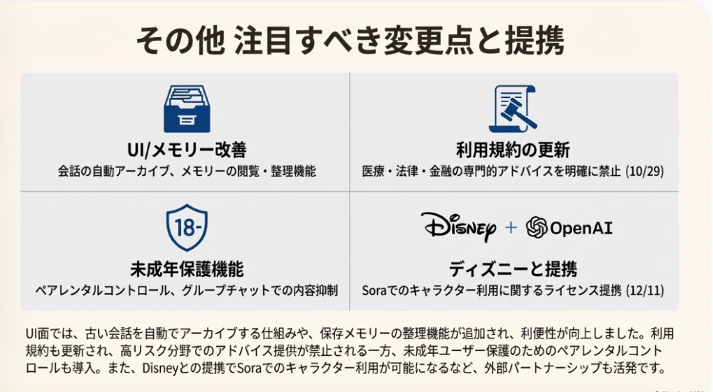 4. 責任あるAIへ:利用ポリシーの更新(10月29日) OpenAIは利用規約を更新し、医療・法律・金融に関する専門的なアドバイスを明確に禁止しました。これは一見すると制限のように思えますが、実はAIが自らの得意分野と限界を理解し、より安全で信頼できるツールになるための重要な一歩です。これにより、ユーザーはAIを過信することなく、適切な場面で専門家の助けを借りるという健全な関係を築けるようになりました。