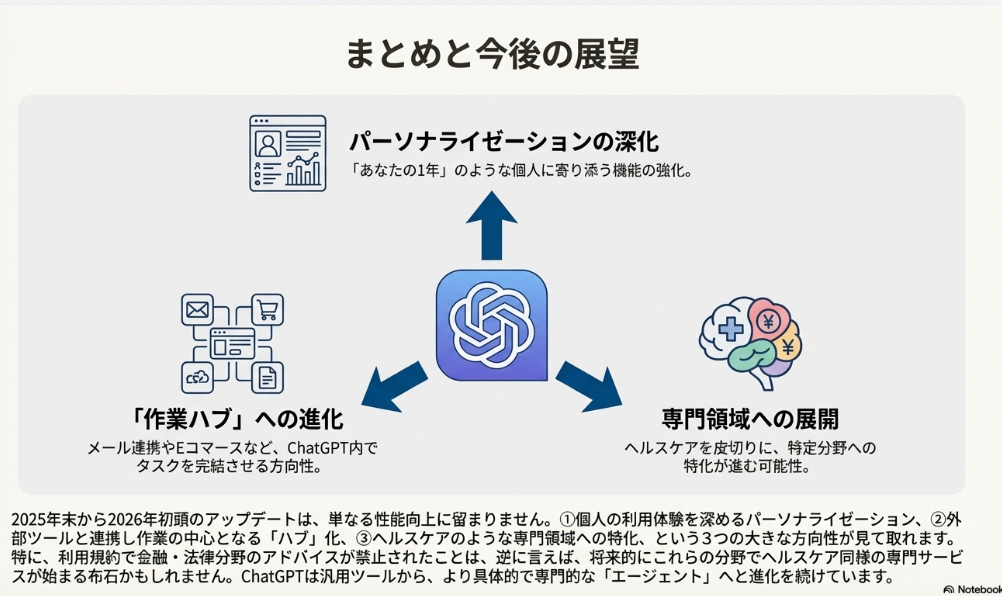 1. 個人の健康を支える「ChatGPTヘルスケア」登場(1月7日) 健康・ウェルネス分野に特化した専用モード「ChatGPTヘルスケア」が発表されました。これは、10月に専門的なアドバイスを一律に禁止した流れを汲むものです。今回は、安全性を最大限に高めた専用モードとして、責任ある形でユーザーをサポートします。Appleヘルスケアなどのアプリと安全に接続し、個人の医療記録に基づいた健康管理のアドバイスを提供。あくまで医療従事者を代替するものではなく、日々の自己管理を支援する補完的な役割を目指しています。