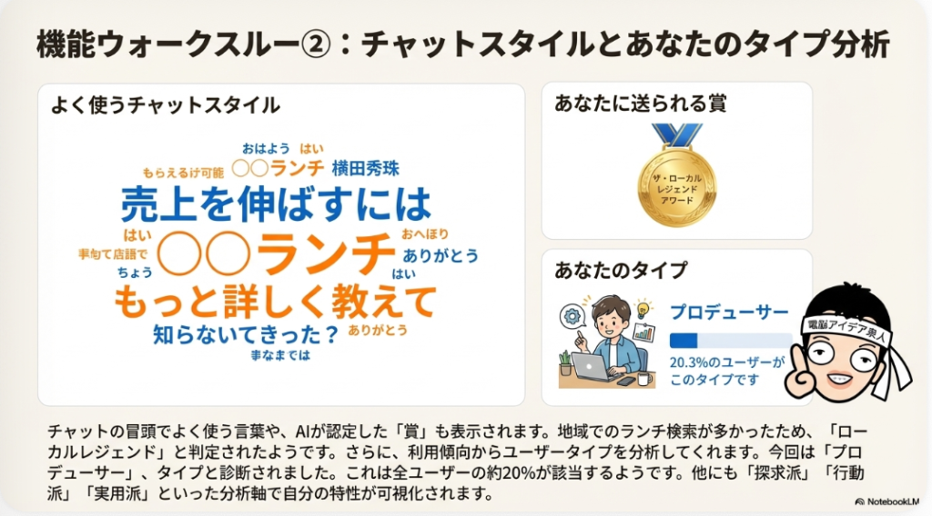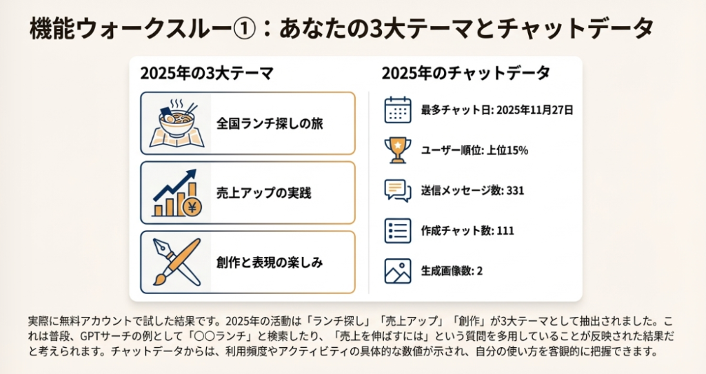 📊 1年間のまとめ機能 ChatGPTの「1年間のまとめ」機能とは、ユーザーの1年間の利用データを分析し、視覚的に振り返る機能です。よく使うフレーズ、チャット回数、画像生成枚数などの統計情報や、ユーザータイプの分析結果を表示します。現在は主に米国で提供されており、日本からはVPN経由でアクセス可能です。