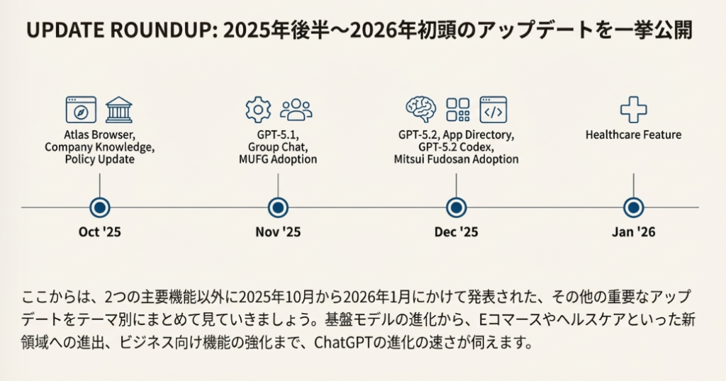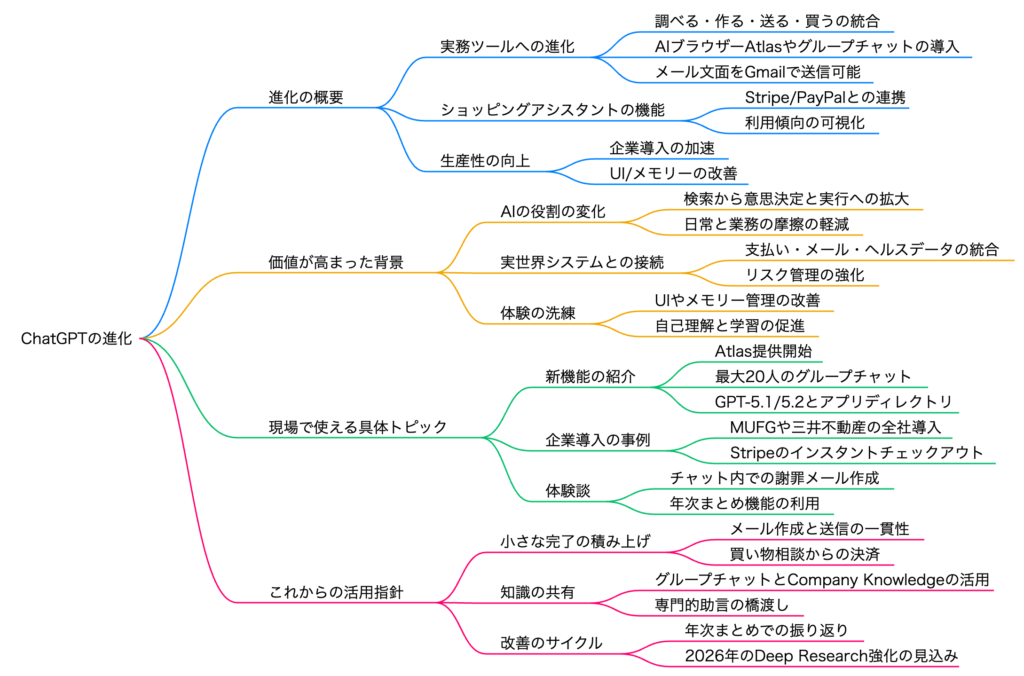 本記事では、2025年10月から2026年1月にかけてのChatGPTの主要アップデートについて、詳しく解説してまいりました。AIブラウザーAtlasの提供開始、社内知識機能Company Knowledgeの導入、グループチャット機能の試験提供、GPT-5.1および5.2モデルのリリース、そしてヘルスケア機能の登場と、わずか数ヶ月の間に目覚ましい進化を遂げています。特に、三菱UFJ銀行や三井不動産といった日本の大手企業が本格導入を発表したことは、ChatGPTが単なるツールから、ビジネスインフラとして定着しつつあることを示しています。「1年間のChatGPTまとめ」機能は、自分の使い方を振り返り、より効果的な活用方法を発見するきっかけとなります。また、新しく追加されたメール作成・送信機能は、日常業務の効率化に直結する実用的な機能です。ChatGPTは今後も進化を続けていくことが予想されます。本記事で紹介した情報を参考に、ぜひ最新機能を活用して、ビジネスの生産性向上にお役立てください。