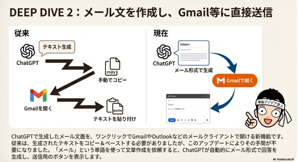 ◦ メール作成が劇的に楽に: これまでも連携機能は存在しましたが、この期間のアップデートで、作成したメール文章をワンクリックでGmailなどの作成画面で開けるようになり、利便性が劇的に向上しました。この一手間がなくなるだけで、作業効率は大きく向上します。