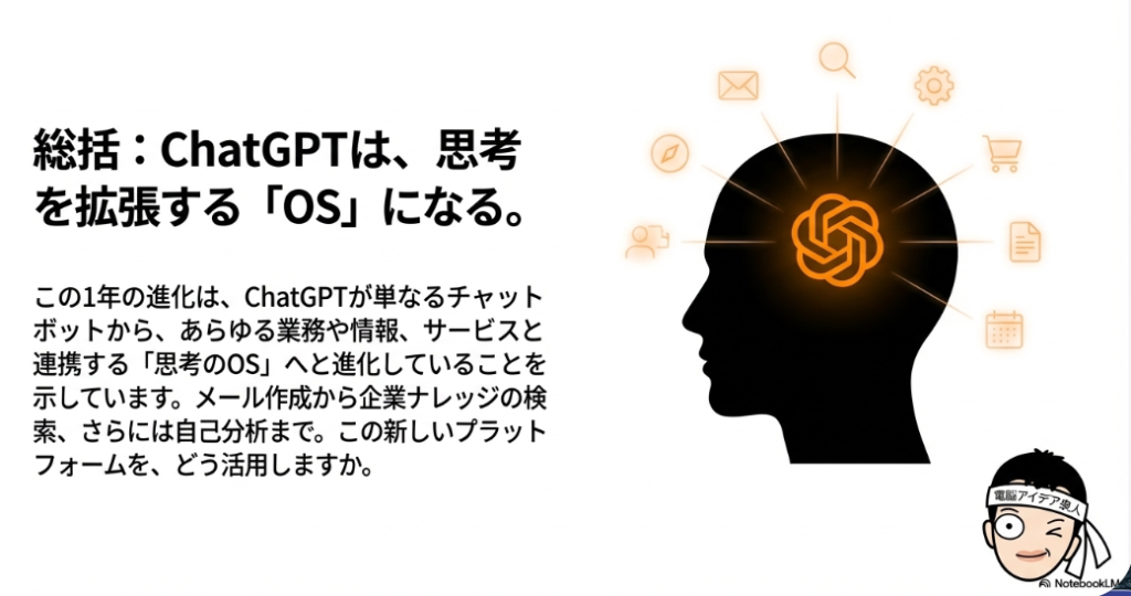 2025年の秋から冬にかけて、私たちが知る「ChatGPT」は、驚くべき変貌を遂げました。単なる質問に答えるチャットボットから、私たちの仕事や生活に深く関わる「プラットフォーム」へと、その役割を大きく広げたのです。まるで数ヶ月で別物に生まれ変わったような、ChatGPTの進化の物語を一緒に追いかけていきましょう。