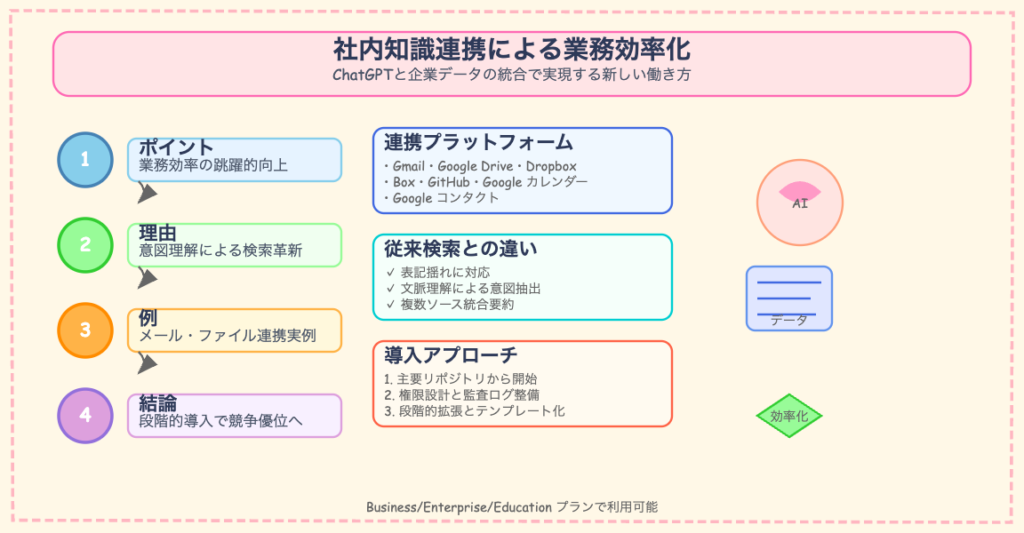 本レポートの核心であるChatGPTの「社内知識」機能は、AIを企業の「クローズドデータ」、つまり組織内部にのみ存在するプライベートな情報資産と接続するための仕組みです。この機能を通じて、以下のような多様な社内サービスに蓄積されたデータがAIの参照範囲となります。