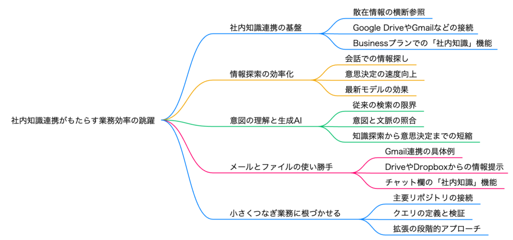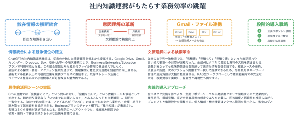 • 真のインテグレーション: 「社内知識」機能の本質は、GmailやGoogleカレンダー、SharePointといったサービス全体とAIを接続することにあります。これにより、AIは特定のファイルだけでなく、サービス内に存在するメールのやり取り、カレンダーの予定、チャットのログといった膨大な情報を、横断的かつ持続的に参照・検索できる状態になります。個別のファイルやデータは、この連携を通じて初めて点から線、そして面へとつながり、「組織の生きた知識ベース」へと昇華するのです。