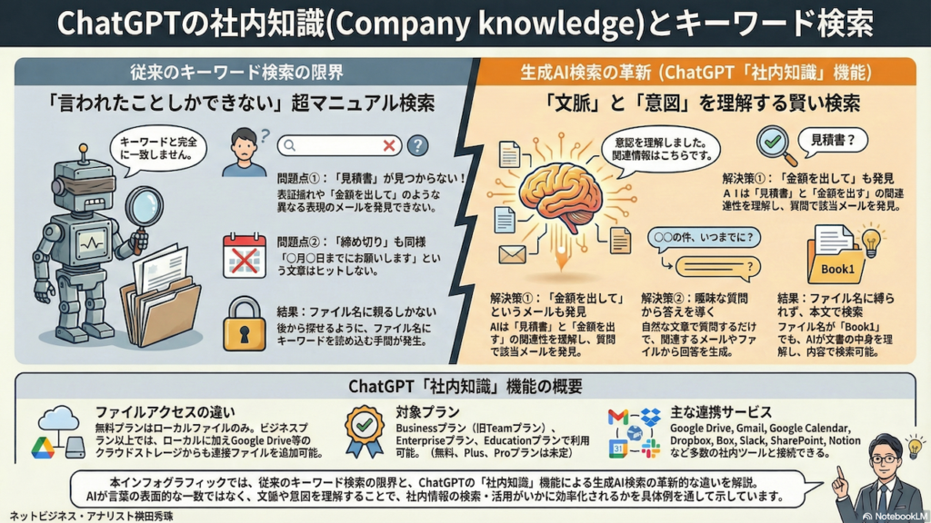ChatGPTの「社内知識」機能について解説した内容です。BusinessプランやEnterpriseプランでは、Google Drive、Gmail、Googleカレンダー、Dropbox、Boxなどの外部サービスと連携し、社内データを横断的に参照できます。従来のキーワード検索では「見積書」と「金額を出して」のような意味的に同じ内容を見つけられませんでしたが、生成AIを活用した検索では文脈や意図を理解して検索できるため、必要な情報を効率的に発見できるようになりました。