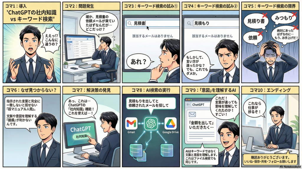 特に重要なポイントは、従来のキーワード検索の限界を、AI検索が見事に克服しているという点です。「見積書」を「金額を出して」という言葉で表現していたとしても、「締め切り」を「いつまでにお願いします」と言い換えていたとしても、生成AIは文脈を理解して、私たちが本当に探したい情報を見つけ出してくれます。