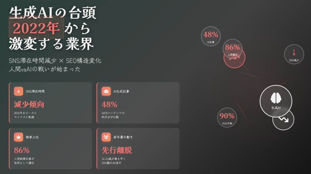 インターネットの世界が大きな転換点を迎えています。私たちが毎日使っているSNSやGoogleでの検索、これらの使い方が劇的に変わり始めているのをご存知でしょうか。特に2022年を境に、これまで右肩上がりで成長し続けてきたソーシャルメディアの利用時間が減少に転じ、同時にAIが生成したコンテンツがWEB上の約半数を占めるまでになりました。長年SEO対策から始まり、SNSマーケティング、そして最近では生成AIまで幅広く携わってきた私にとって、この3つの分野が同時に大きな変化を迎えている今の状況は、まさに歴史的な転換期だと感じています。今日は、この衝撃的なデータと共に、私たちのビジネスやコミュニケーションがどう変わっていくのか、そしてどう対応していくべきなのかについて、詳しく解説していきたいと思います。