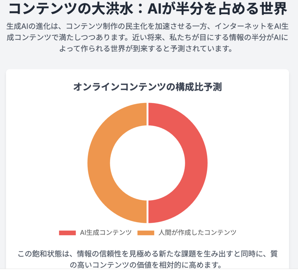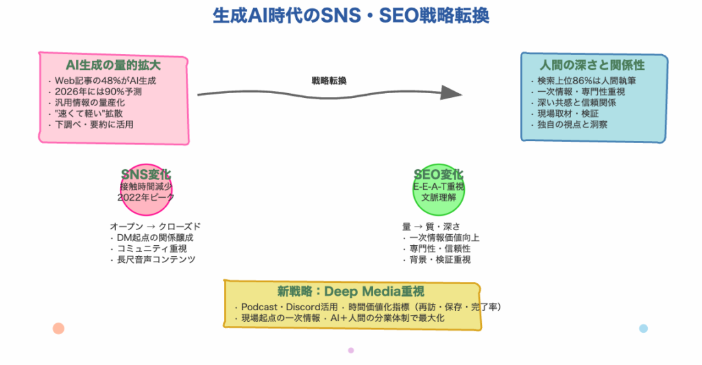 生成AIの台頭は、ウェブコンテンツの生態系を不可逆的に変容させました。コンテンツの量は爆発的に増加し、新規記事の過半数がAIによって生成されていますが、競争の舞台は量(Volume)から**可視性(Visibility)と信頼性(Trust)**へと決定的にシフトしています。ディープメディアの時代において、偽情報のリスクが高まるほど、信頼性の欠如はコンテンツ自体の価値をゼロにするリスクをはらみます。