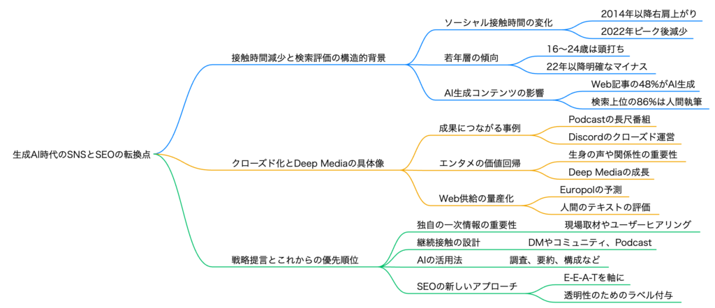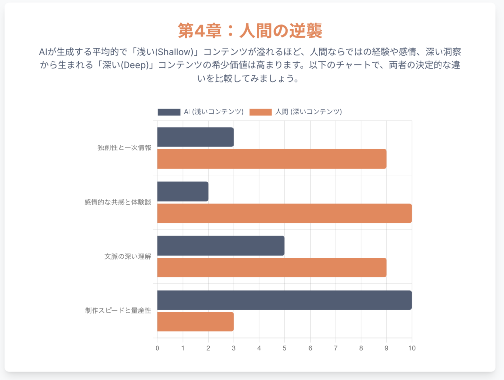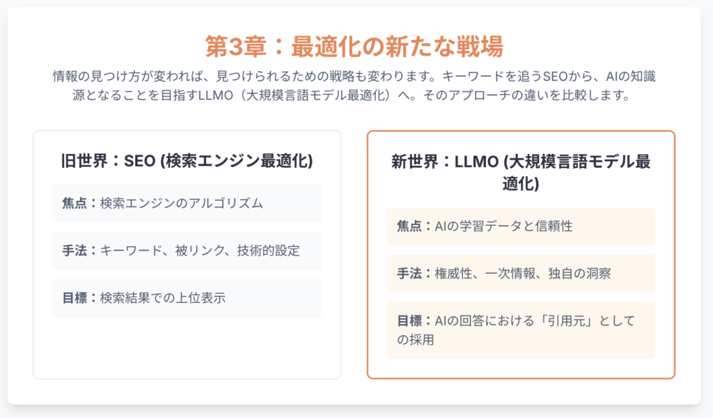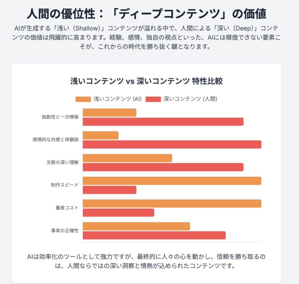 - 人間的価値の再定義: E-E-A-TおよびLLMOという戦略を通じて、AIの構造的弱点(経験の欠如、倫理的判断の困難性)を突く、人間固有の価値を競争優位性として確保する。