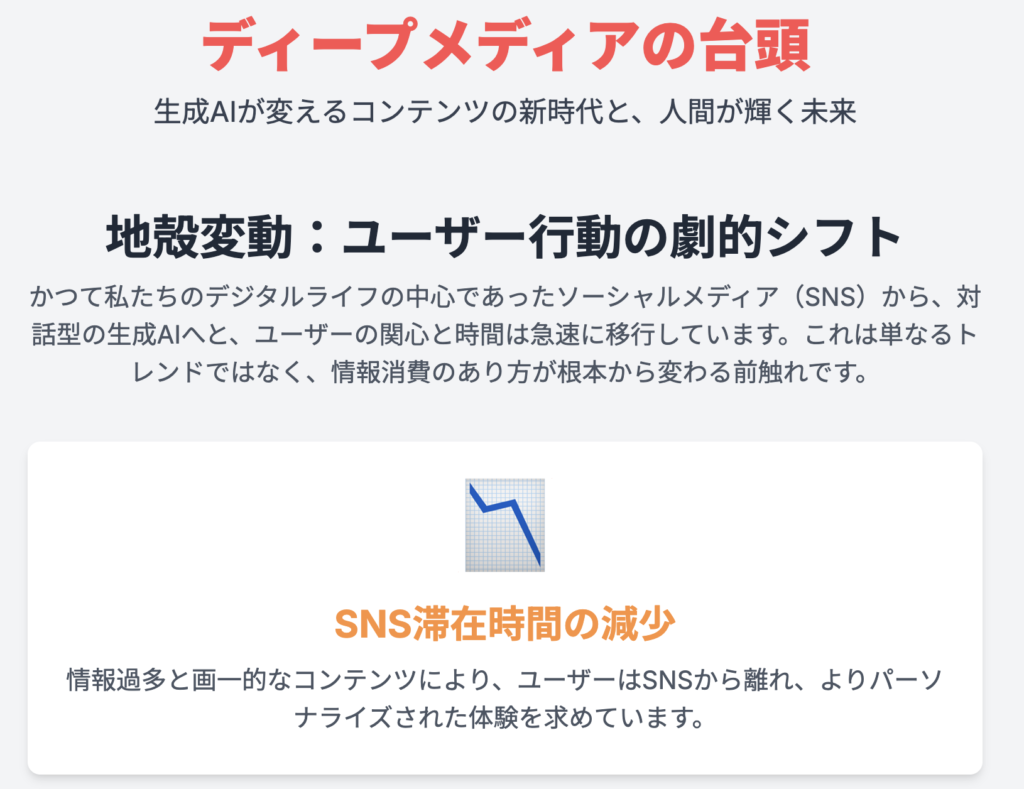 📊 SNS滞在時間の減少 2022年のChatGPT登場をきっかけに、世界的にソーシャルメディアの接触時間が初めてマイナスに転じた現象。特に若年層で顕著であり、オープンSNSからの離脱が加速している。この変化はメディア史上初めての減少トレンドとして注目されている。