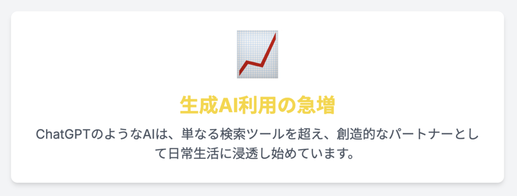 🤖 生成AI ChatGPTをはじめとする人工知能技術で、テキスト、画像、音楽、動画などを自動生成する技術。Web記事の48%がAI生成となり、人類史上のすべての写真を上回る画像を生成するなど、圧倒的な量のコンテンツを生み出している。