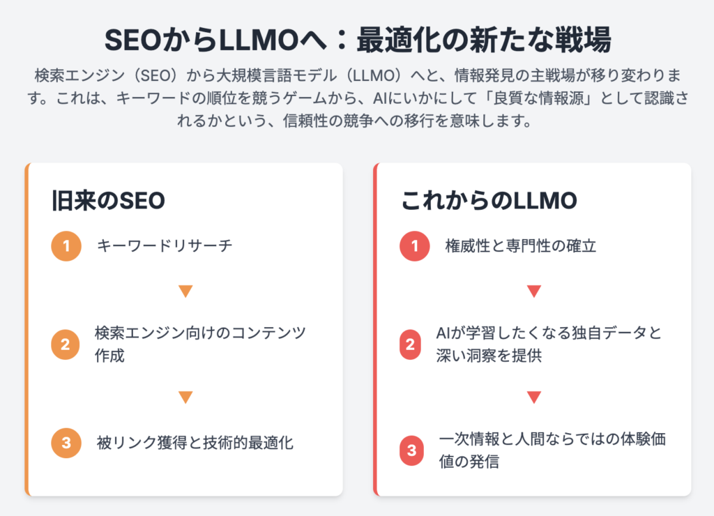 コンテンツの成功には、E-E-A-Tという人間的価値を、LLMOという技術的構造によってAIに提示する二重のアプローチが必須となります。