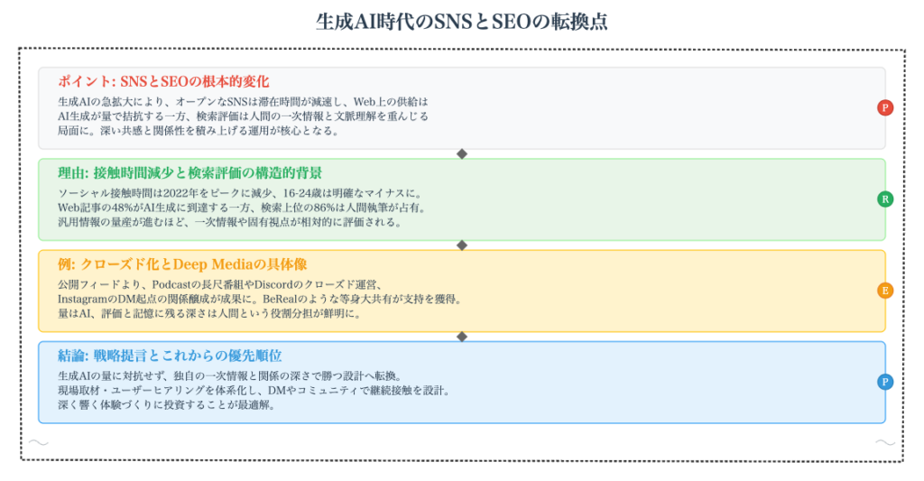 生成AI登場以降、SNS滞在時間が2022年をピークに初めて減少している。AIコンテンツがWeb記事の半数に達する一方、検索上位86%は人間執筆の記事が占める。若年層を中心にオープンSNSから離れ、PodcastやDiscordなどクローズドSNSへ移行する流れが顕著だ。数字重視から深い共感を生む「Deep Media」へ、エンタメやコンテンツの価値基準が大きく変化している。