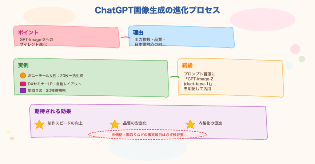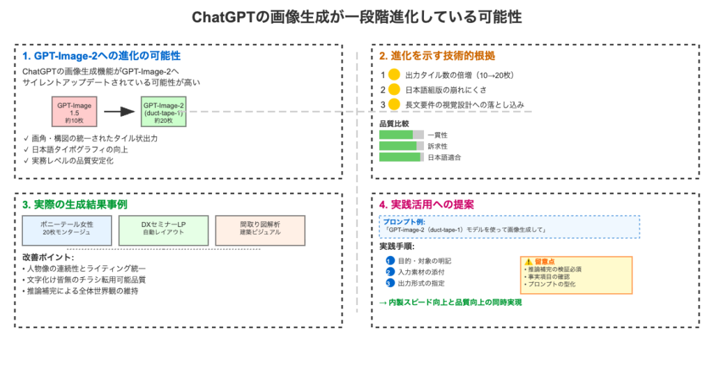 今回は、ChatGPTの画像生成モデルがGPT-Image-2へとサイレントアップデートされている可能性について、実際の検証結果を交えながら詳しくお伝えしてきました。