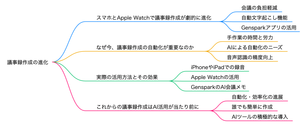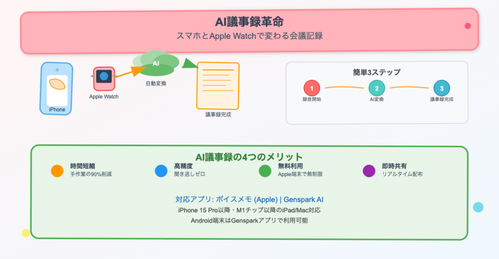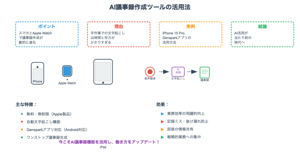 会議や打ち合わせ、セミナーなどで「あとで議事録を作成しなければならない」と憂鬱になった経験はありませんか。手書きでメモを取りながら聞くのは困難で、録音したものを後から文字起こしするのも時間がかかる面倒な作業です。しかし、2025年4月1日以降、iPhoneユーザーには革命的な変化が起きています。Apple Intelligenceに対応したiPhoneであれば、無料で無制限に音声の文字起こしが可能になりました。さらに、Apple Watchからも簡単に録音と文字起こしができ、まさに「神機能」と呼べる便利さを実現しています。また、iPhoneを持っていない方やApple Intelligence非対応の方にも優秀な解決策があります。GensparkというAIアプリを使用すれば、AndroidでもiPhoneでも議事録の自動作成が可能となります。本記事では、この2つの画期的な方法について詳細に解説していきます。これらの方法を活用することで、従来の手動作業を大幅に効率化し、重要な会議や打ち合わせに集中できるようになります。
