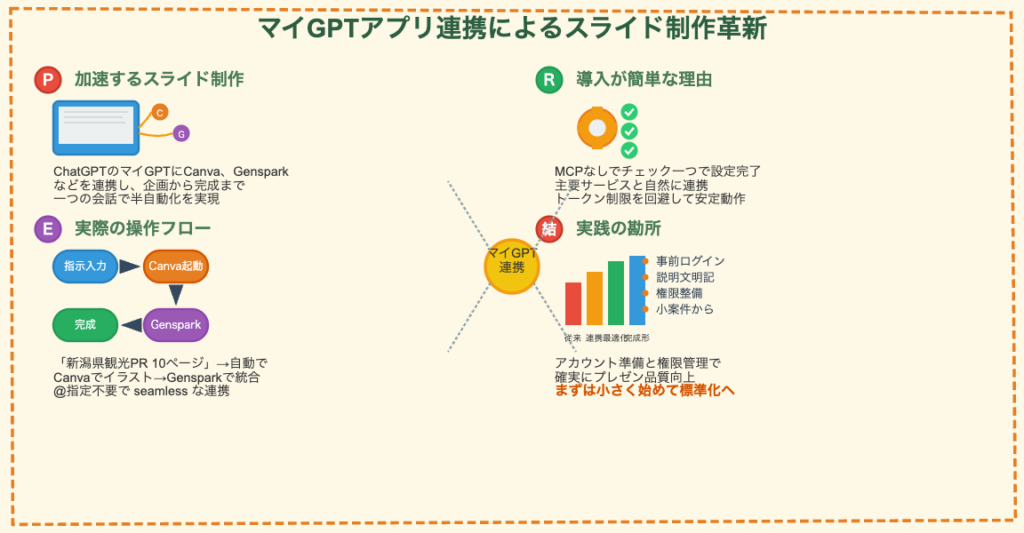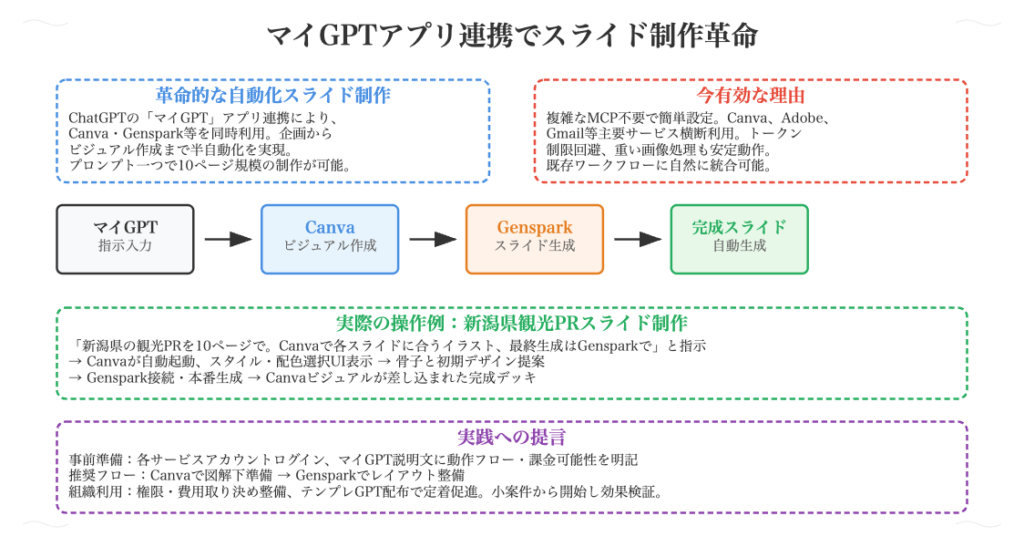 🌐 スライド生成自動化 GPTsにCanvaやGensparkを連携させることで、プロンプト一つでイラスト生成からスライド作成までを一気通貫で自動化できるワークフロー。AIがユーザーの指示を解釈し、複数のアプリを順番に呼び出して成果物を仕上げる次世代的な活用方法。