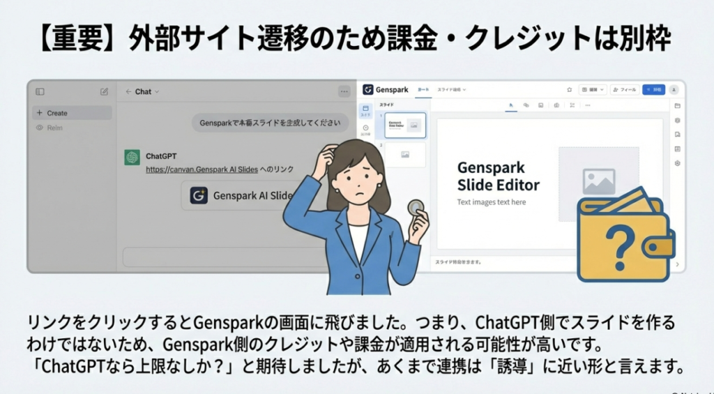 Gensparkとの連携では、ChatGPT側でスライドを生成するわけではなく、Genspark側に処理が飛ぶ形になっています。したがって、スライド生成に際してはGenspark側のクレジット・課金が消費されることになります。「ChatGPT経由で使えばGenspark側の課金を節約できるのでは?」という期待は、今のところ叶わないようです。