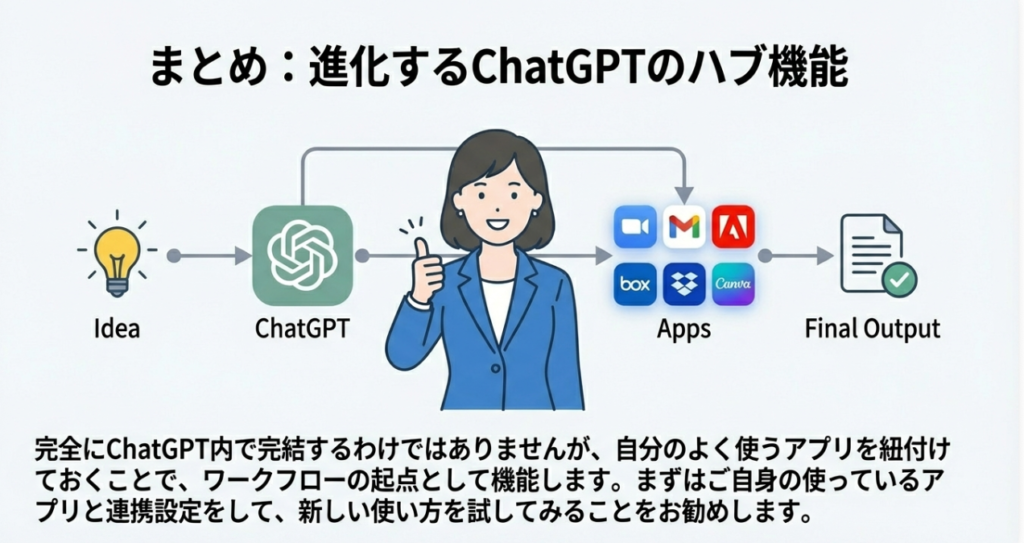 ChatGPTは常に進化し続けており、今後さらに多くのアプリとの連携が可能になることが予想されます。この機能はまだ発展途上の部分もありますが、早い段階から試しておくことで、いち早く活用の感覚をつかむことができます。ぜひご自身のよく使うアプリと連携させて、ChatGPTの可能性をさらに広げてみてください。