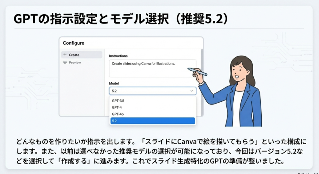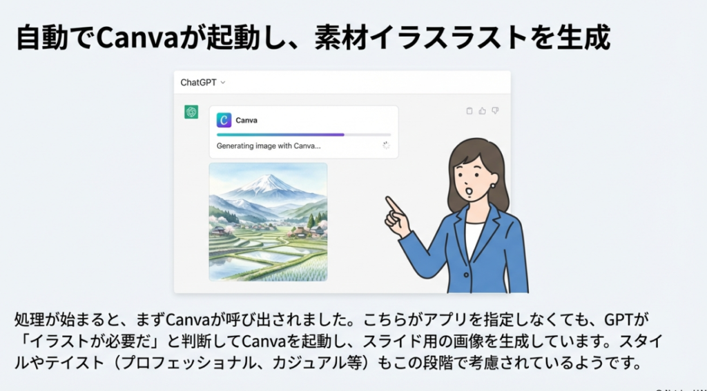 2. Canvaによるアセット生成(Asset Generation) ChatGPTは即座にCanvaを呼び出し、スライドの文脈に合致した独自のイラストや図解を生成します。