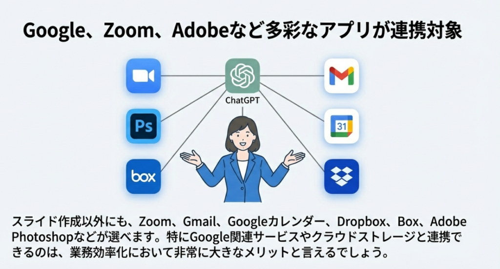A. CanvaとGenspark AI Slides以外にも、多くのアプリが連携候補として用意されています。現在確認されている主なアプリには、Adobe Photoshop(画像編集)、Gmail・Google カレンダー(Googleの各種サービス)、Zoom(ビデオ会議)、Dropbox・Box(クラウドストレージ)などがあります。今後もさらに連携アプリが増えていく可能性が高いため、定期的にChatGPTのアップデート情報をチェックしておくことをおすすめします。