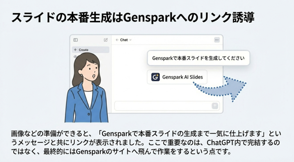 つまり、ChatGPTはあくまで「橋渡し役」であり、スライドの実際の生成はGenspark側で行われるという仕組みになっています。