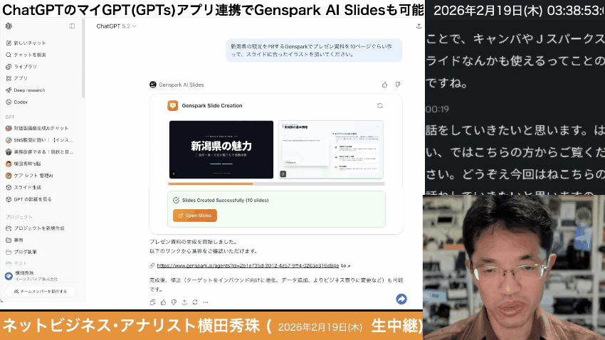 接続完了後、GPTsのチャット画面に「Gensparkで本番用の新潟県観光PRスライドを生成しました。以下のリンクから確認いただけます」というメッセージが届きました。リンクをクリックするとGenspark側の画面に遷移し、そちらでスライドが生成されているという流れでした。