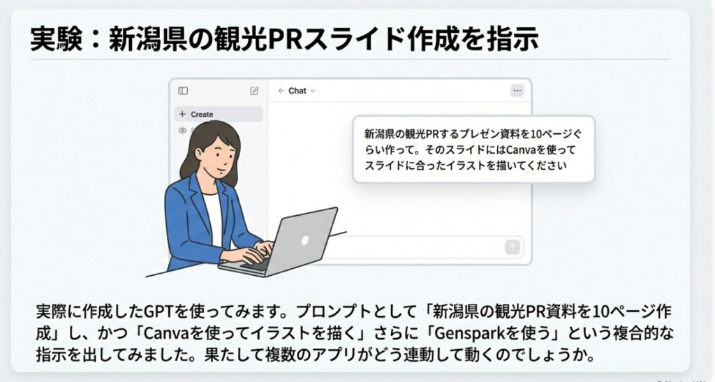 1. ストラテジック・プロンプトの発行 ユーザーは「新潟県の観光戦略に基づいた10ページのスライド構成を策定し、Canvaで最適なイラストを生成、Gensparkで本番用スライドに仕上げてほしい」と指示します。
