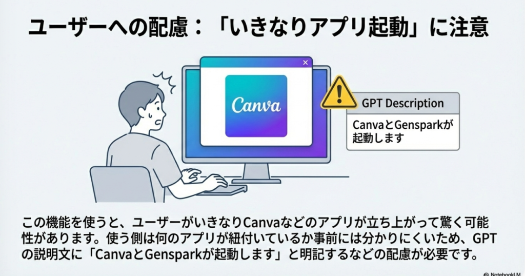 A. 現時点では、GPTsの画面上にアプリのアイコンや一覧が明示される機能はありません。そのため、GPTsを使っていると突然Canvaが起動するなど、戸惑うケースがあります。GPTsを作成・公開する際は、説明文(ディスクリプション)に連携しているアプリ名を明記しておくことが、ユーザーへの親切な対応となります。今後のアップデートでアイコン表示などが追加されることが期待されます。