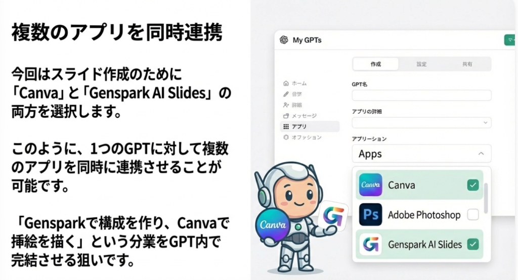 🔗 アプリ連携 GPTsの作成画面から外部サービスを紐づけ、GPTsの会話内でそのアプリを自動的に呼び出せるようにする機能。CanvaやGensparkのほか、Gmail、Google カレンダー、Zoom、Dropbox、Adobe Photoshopなど多様なサービスと連携可能。