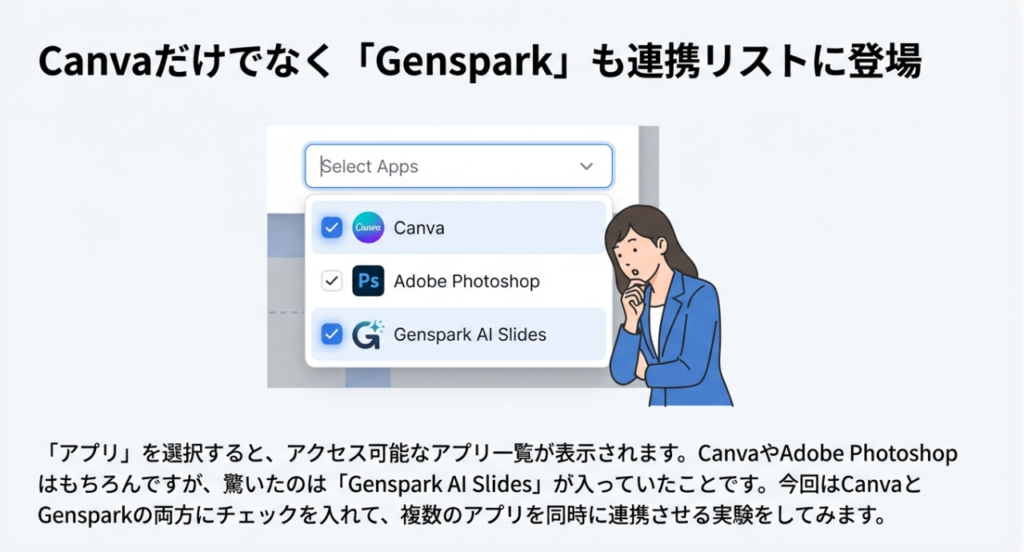 まずはCanvaやGensparkなど、自分が普段使っているアプリとの連携を試してみることをおすすめします。