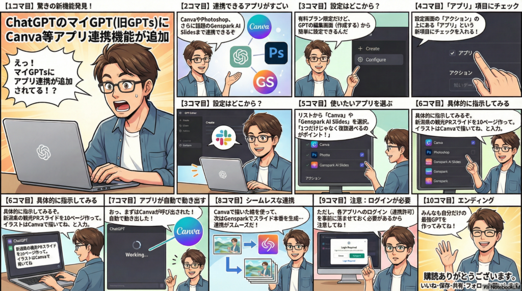 今回は、ChatGPTのマイGPTsに追加されたアプリ連携機能について、実際に試した体験を交えながら詳しくご紹介しました。CanvaやGenspark AI Slides、Adobe Photoshop、Gmail、Google カレンダー、Zoom、Dropboxなど、日常的に使うアプリとChatGPTを組み合わせることで、業務の効率化やクリエイティブな作業の自動化が現実のものになってきています。
