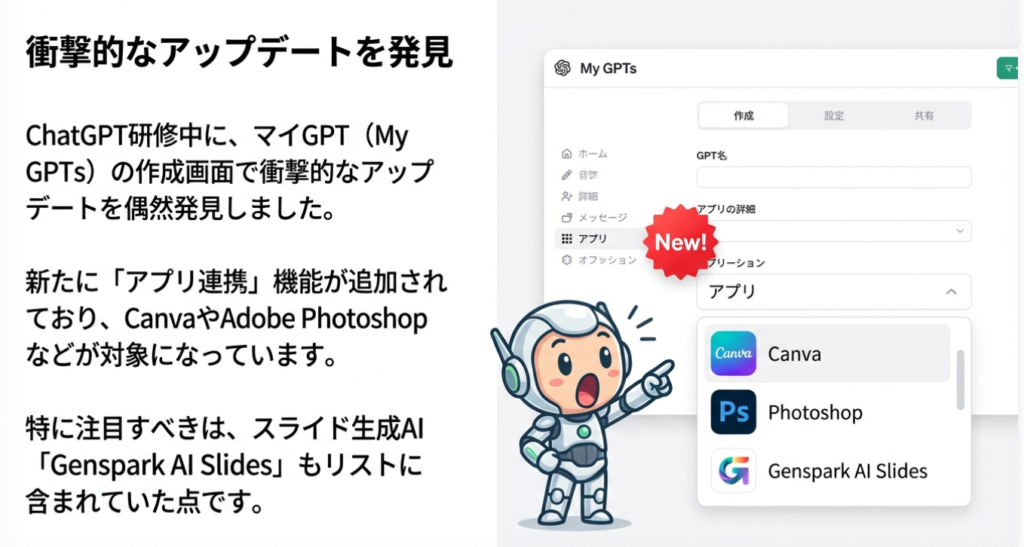 ChatGPTのマイGPTs(旧GPTs)に、CanvaやGenspark AI Slidesなど外部アプリと連携できる新機能が追加された。有料プランのGPTs作成画面から複数のアプリを選択・連携でき、スライド生成などを自動化できる。ただし利用者側が各アプリにログイン・接続している必要があり、実際の処理は連携先アプリ側で行われるため、その課金体系も連携先に依存する。
