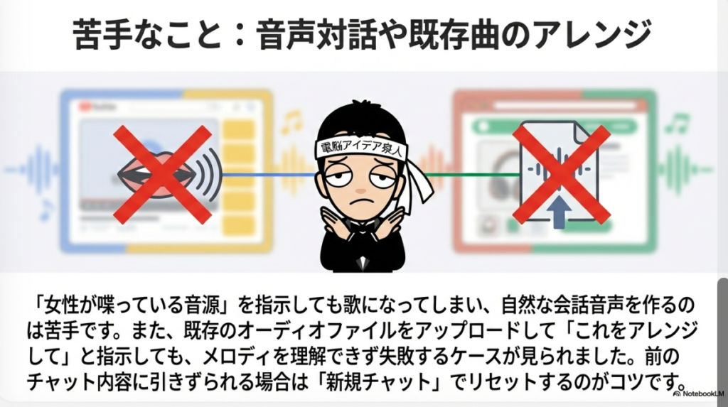 1. 対談・トーク生成の失敗: 「男女の会話音源」などの生成を依頼しても、現状は歌になってしまい、純粋な会話は生成できません。