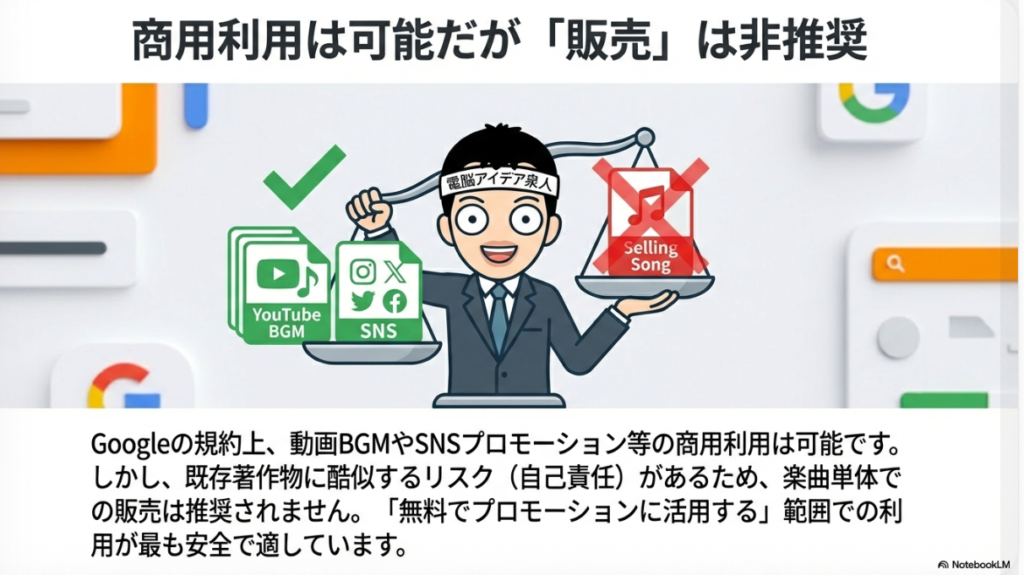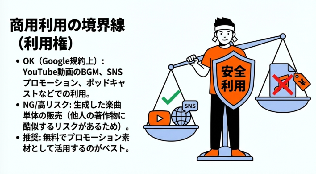 💼 商用利用 GoogleのGemini利用規約上、生成した音楽をYouTubeのBGMやSNSプロモーション、ポッドキャストなどに使うことは認められている。ただし音楽配信プラットフォームでの単体販売は権利侵害リスクがあるため推奨されず、あくまでBGMとしての活用が最も安全とされる。