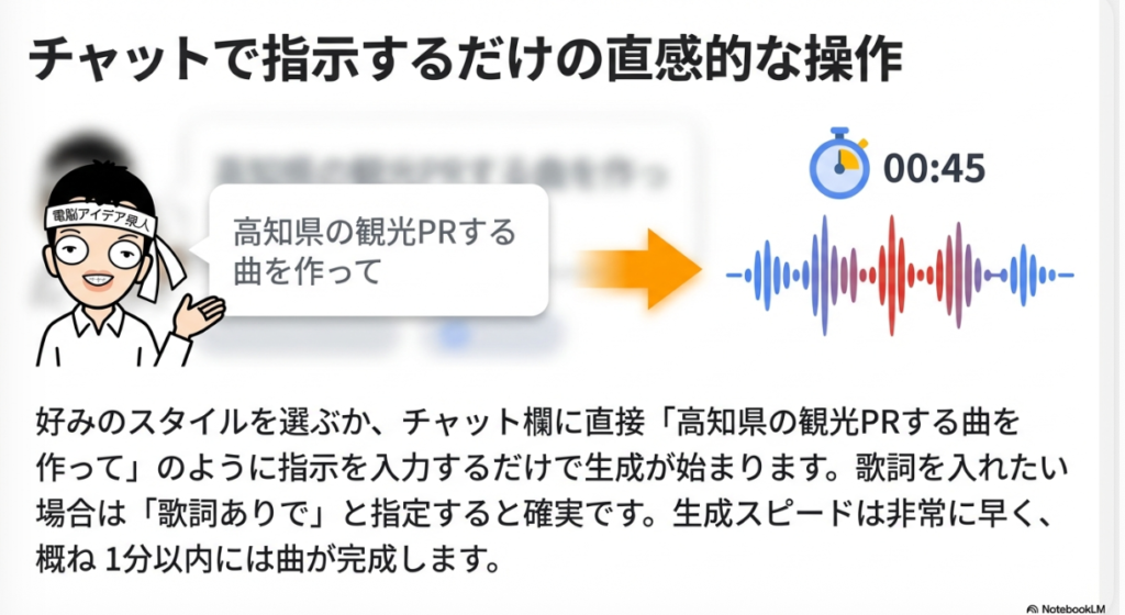 これが何を意味するかというと、「曲を作って」とチャットに入力するだけで、本格的な楽曲が30秒以内に生成されてしまう、ということです。専用のサイトに行く必要もなく、アカウントを新たに作る必要もない。すでに使っているGeminiの画面から、ボタン一つで音楽制作が始められる時代がやってきたのです。