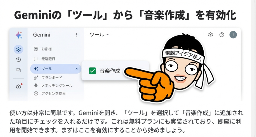 ① Geminiを開く → ②「ツール」→「音楽作成」を選択 → ③ チャットで曲の指示を入力するだけ!