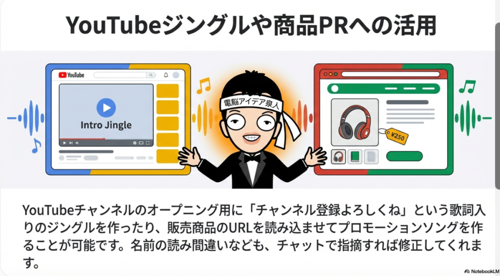 - 「YouTubeチャンネルのジングル」→ 最後に「チャンネル登録よろしくね」と歌ってくれた