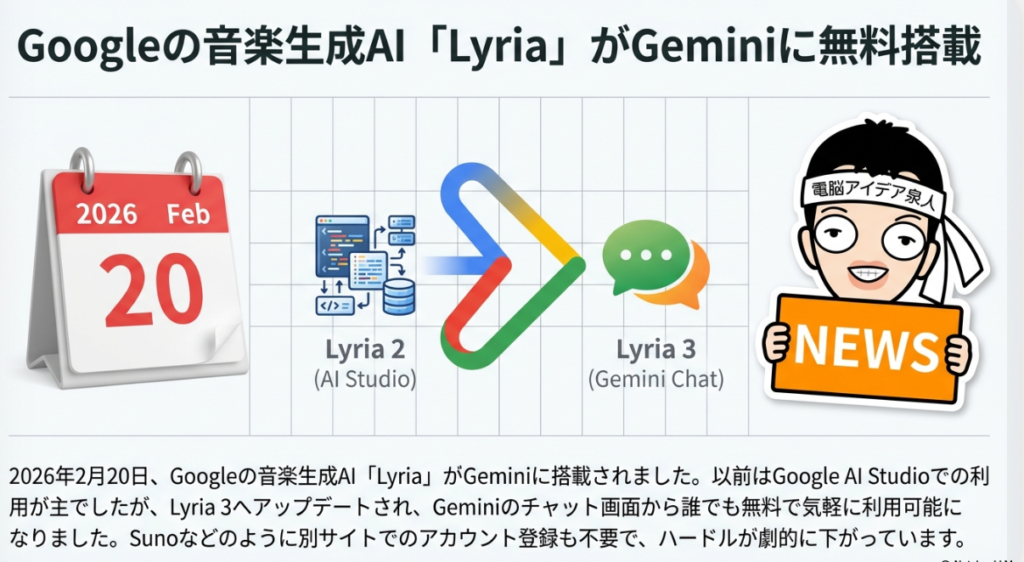 今日は2026年2月20日(金)に発表された、AIの新しいサービスをご紹介します。それが、GoogleのAI音楽生成サービス「Lyria」がGeminiに搭載されたというニュースです。